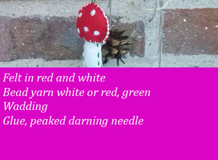 Here’s the promised fly agarlic together with a new idea for decoration. You’ll find the link for a pattern here. In addition you need some twigs, cones, berries or anything else you find in the woods and some ribbons matching with the autumn colors or the room you want to decorate. I’ve sewn one garlic with buttonhole and one with basting stitch. I chose gleaming white bead yarn because it lightens the red felt and matches with the spots. Head and shaft of the agarlic have to be cut in red and white twice. I startet to sew one shaft with buttonhole stitch to the first side of the head. Then I continued sewing both heads together, finishing with the fixing of the second shaft. Both sides of the shaft should be sewn together with green yarn. Just before the end of the seam fill the agarlic with some wadding and then finsh it. You need to cut some white felt spots of about 0,4 inches and fix them with some glue. Finally pull a 6 inch long thread through the red felt to hang it up.