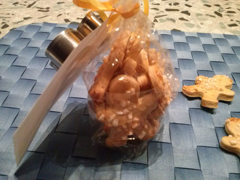 KeksmaennerengljChristmas is approaching and you can find cookie cutters of all sizes and forms. Some of them found their way into my basket and back home I immediately tried them for a short pastry recipe. Mix all ingredients at room temperature with the  dough hooks of your food processor and let rest for about 30 minutes. Then unroll the pastry and cut out as many cookies as possible. For those you don’t want to coat with chocolate later you may whisk an egg yolk with some milk and apply it on the cookies. Then spread some coarse sugar on top. The cookies then should stay in the oven for 15-20 minutes at 180°C. Those without sugar can be coated with melted chocolate as soon as they cooled down. Put them in a cellophane bag, add the printed recipe as well as the cookie cutter and ready is the cutest little present for beloved friends.