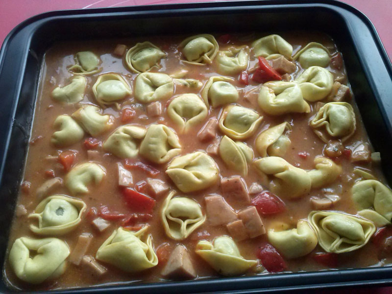 AuflaufengljA real tasty casserole quite easy and quick to cook. Boil tortellini according instructions on package and fill in a casserole dish. Cut pork sausage, pepper and sahllotts in small pieces. Roast sausage and shallotts in cooking oil and add the pepper. Pour cream and tomatos into the pan and stir slightly. Flavor with black pepper, salt and a bit of chilli powder and pour sauce into the casserole. Scatter with grounded cheese and cook in oven at 390°F for about 20 minutes.