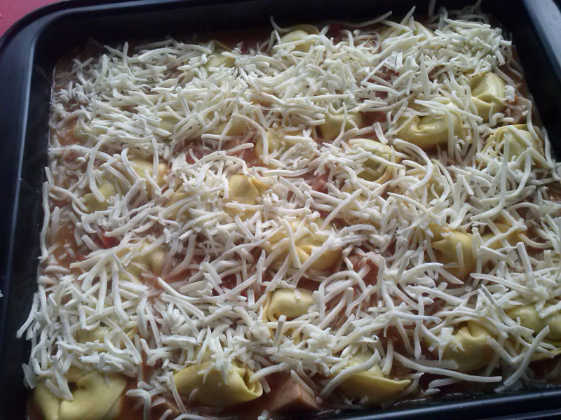 AuflaufengljA real tasty casserole quite easy and quick to cook. Boil tortellini according instructions on package and fill in a casserole dish. Cut pork sausage, pepper and sahllotts in small pieces. Roast sausage and shallotts in cooking oil and add the pepper. Pour cream and tomatos into the pan and stir slightly. Flavor with black pepper, salt and a bit of chilli powder and pour sauce into the casserole. Scatter with grounded cheese and cook in oven at 390°F for about 20 minutes.