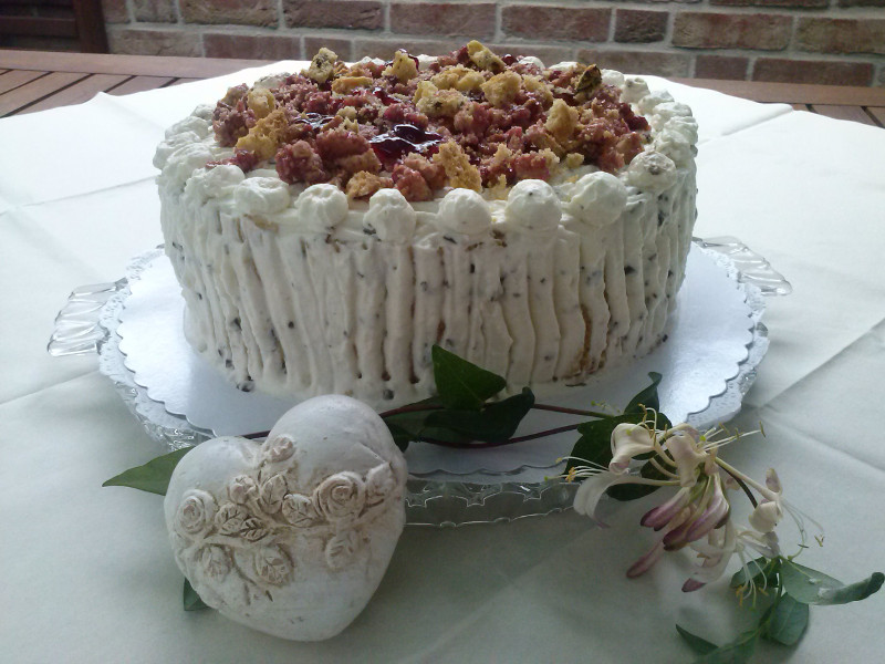 In the meantime batter cream with gelatine, vanilla sugar, stracciatella yoghurt and rasped chocolate. If you want to decorate your cake like I did you should take away some cream before adding yoghurt and chocolate. They’d block the opening of your pastry bag. Now place the short pastry bottom on a cake board. Spread 2/3 of the whipped cream on the sponge cake. Cut 5-6 strips of the sponge cake, disperse 2/3 of the lingonberries in their middle and make a roll of the first one. Place this roll in the middle of the short pastry, attach the other strips in spirals and push together carefully. After the placement of all strips you may cut off the overlaying short pastry and crumble it in a bowl. Now cover your cake with the last third of cream and design the edge with a baking comb. I also did it with the top of the cake to get some more practice and then put some little cream tops non the upper border. At last the crumbled short pastry and the remaining lingonberries are heaped up in the middle of the cake top. Put it in the fridge for at least two hours before serving.
