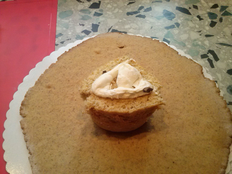 In the meantime batter cream with gelatine, vanilla sugar, stracciatella yoghurt and rasped chocolate. If you want to decorate your cake like I did you should take away some cream before adding yoghurt and chocolate. They’d block the opening of your pastry bag. Now place the short pastry bottom on a cake board. Spread 2/3 of the whipped cream on the sponge cake. Cut 5-6 strips of the sponge cake, disperse 2/3 of the lingonberries in their middle and make a roll of the first one. Place this roll in the middle of the short pastry, attach the other strips in spirals and push together carefully. After the placement of all strips you may cut off the overlaying short pastry and crumble it in a bowl. Now cover your cake with the last third of cream and design the edge with a baking comb. I also did it with the top of the cake to get some more practice and then put some little cream tops non the upper border. At last the crumbled short pastry and the remaining lingonberries are heaped up in the middle of the cake top. Put it in the fridge for at least two hours before serving.