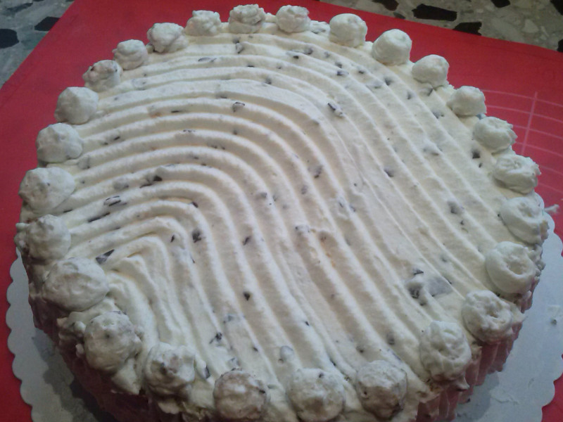 In the meantime batter cream with gelatine, vanilla sugar, stracciatella yoghurt and rasped chocolate. If you want to decorate your cake like I did you should take away some cream before adding yoghurt and chocolate. They’d block the opening of your pastry bag. Now place the short pastry bottom on a cake board. Spread 2/3 of the whipped cream on the sponge cake. Cut 5-6 strips of the sponge cake, disperse 2/3 of the lingonberries in their middle and make a roll of the first one. Place this roll in the middle of the short pastry, attach the other strips in spirals and push together carefully. After the placement of all strips you may cut off the overlaying short pastry and crumble it in a bowl. Now cover your cake with the last third of cream and design the edge with a baking comb. I also did it with the top of the cake to get some more practice and then put some little cream tops non the upper border. At last the crumbled short pastry and the remaining lingonberries are heaped up in the middle of the cake top. Put it in the fridge for at least two hours before serving.
