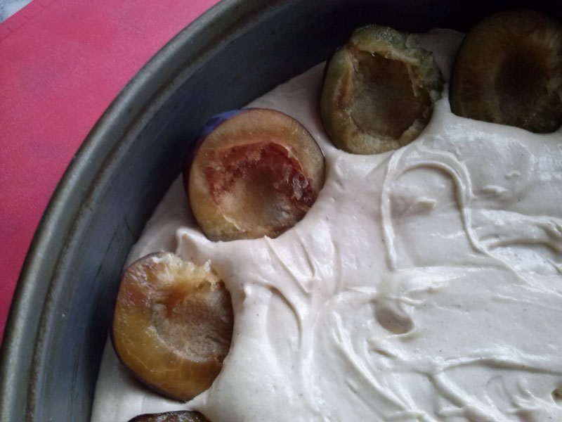 Clean damsons, pit and if necessary cut in halves. Give batter into the parchment covered springform pan and arrange damsons on top beginning at the edge. The cake should stay in the oven at 420°F for about 30-35 minutes. After baking take off the cake with its parchment paper and pull on a rack. If the damsons are a bit too acid you may sweaten them with sugar mixed with cinnamon.