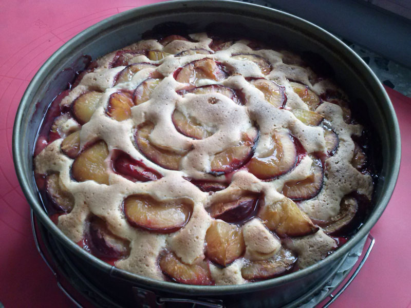 Clean damsons, pit and if necessary cut in halves. Give batter into the parchment covered springform pan and arrange damsons on top beginning at the edge. The cake should stay in the oven at 420°F for about 30-35 minutes. After baking take off the cake with its parchment paper and pull on a rack. If the damsons are a bit too acid you may sweaten them with sugar mixed with cinnamon.