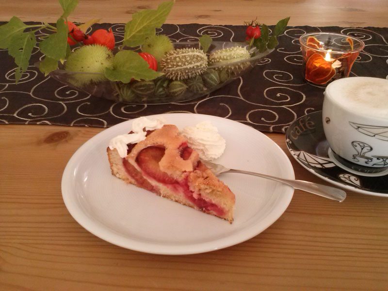 PflaumenruehrenglWe celebrate reunification tomorrow but the rest of theweek-end is booked for redecoration of our living-room. There won’t be much time left for cooking and baking. A little break on our sunny terrace however should be possible. This sponge cake with damson is made within the time of drinking a cup of coffee and while it’s cooking you may continue working. Give butter, sugar and vanilla sugar in a large bowl and stir carefully. Then add each egg seperately and pound until volume has increased considerably. Scatter sieved flour and cinnamon. (Please take tea spoon only and not table spoon as mentioned above).
